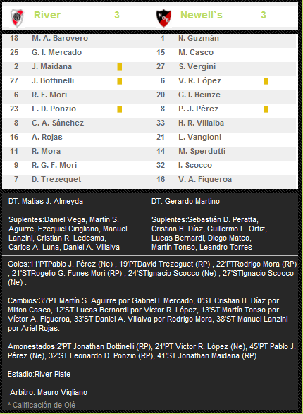 LOS GOLES: Los tres jugadores de River (TREZEGUET-MORA-FUNES MORI) le convirtieron a la lepra por primera vez en sus carreras. En tanto PABLO PEREZ convierte su 1º gol en el Torneo Inicial y su 1º gol a River, en total suma 12 goles con la rojinegra. Por su parte, NACHO SCOCCO se afianza como goleador rojinegro y goleador del Torneo con 4 gritos junto a Borghello (All Boys) y Ramirez (Godoy Cruz). Scocco suma 24 goles con la rojinegra (20 en AFA y 4 en Copa Libertadores).