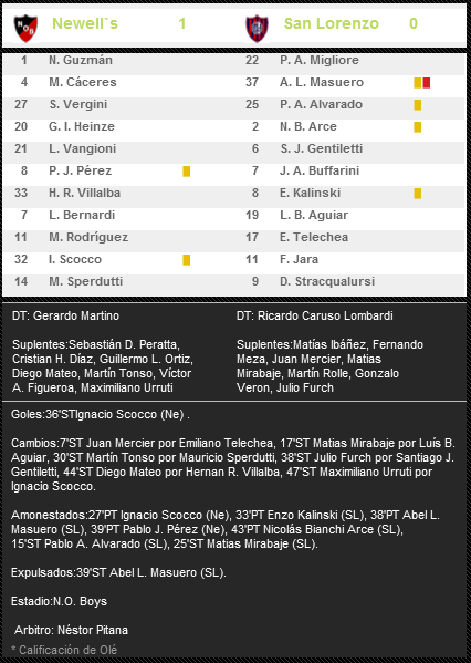 PENAL Y GOL: Parecía todo un record la falta de penales a favor de la lepra. El último penal antes de este torneo tenía fecha 29/10/2011 cuando Vergini ante el arquero Tombolini (Olimpo) lo canjeaba por gol. Pasaron 30 fechas hasta que en la número 6 del actual Torneo, el árbitro Vigliano vuelve a pitar en favor de la lepra. Scocco grita gol ante Barovero (River) y ahora otra vez por segunda vez consecutiva, Pitana vuelve a fallar en favor de NOB y el infalible Nacho rompe la red custodiada por Pablo Migliore (San Lorenzo). El último registro de doblete corresponde a las fechas 18 y 19 del Clausura 2010, en dicha oportunidad, Boghossian y Schiavi convierten ante Sessa (Gimnasia LP - 18) y el flaco Schiavi vuelve a hacer lo propio ante el mismo Pablo Migliore (San Lorenzo - 19). En la última década solo cobraron penal a favor de Newells y ante San Lorenzo en 2 oportunidades, en ambas Migliore fue el arquero, primero Schiavi (CL 2010) y luego Scocco (Inicial 2012) lo cambiaron por gol. Respecto al arquero Migliore cabe destacar que vistiendo la camiseta de Racing en el Apertura 2008, le atajó el penal al Pepi Zapata en lo que fue la despedida de Ariel del futbol leproso y nacional.