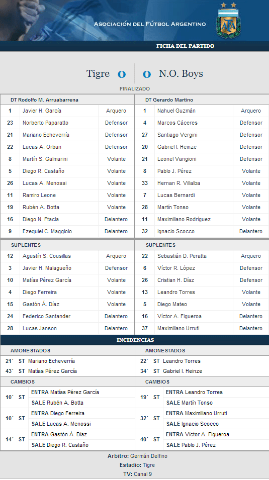 HISTORIAL TIGRE vs NOB: la lepra mantiene la diferencia de 13 victorias sobre Tigre en un total de 43 partidos en el historial. El equipo del TATA Martino rompe una racha negativa de 3 derrotas consecutivas frente a Tigre (CL 2011 - AP 2011 - CL 2012). El último gol leproso frente a los de Victoria fue de Victor Figueroa el 18/05/2012 (1-3). La lepra no logra un triunfo en Tigre desde aquel 02/11/2009 por la fecha 12 del Apertura 2009 (2-1) con goles de Formica y Boghossian de cabeza. EL mismo escopeta puso el 1 de Tigre en contra.
