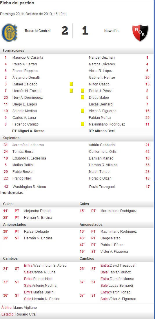 LOS MAXIMOS REFERENTES PERDIERON POR PRIMERA VEZ: Se dió un caso muy curioso, Bernardi (8 clásicos), Perez (3 clásicos), Mateo (4 clásicos) y Maxi Rodriguez (4 clásicos), perdieron por primera vez el derby rosarino. Mientras que Manso (13 clásicos) y Heinze (2 clásicos) lo perdieron por 2ª vez. EL resto de los jugadores debutaron con una derrota.