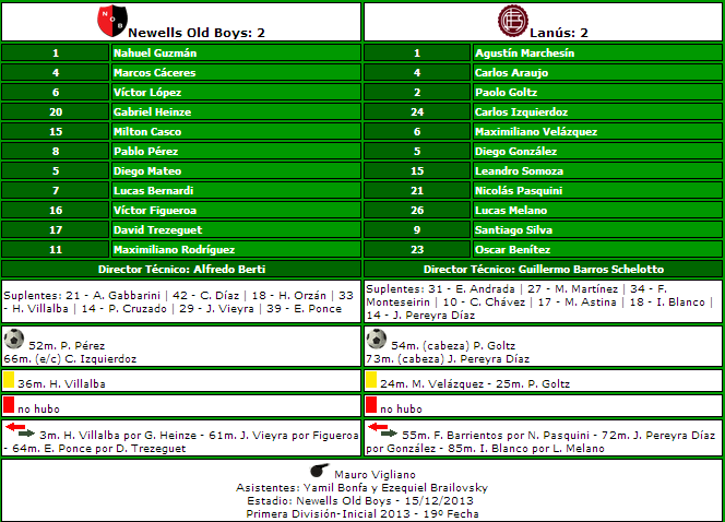 2-2 EL RESULTADO: Por torneos cortos empatamos 2-2 en 41 oportunidades, 22 de local y 19 de visitante. El último había sido frente a Colón en Santa Fe por la fecha 14 del Torneo Inicial 2013. La última vez que la lepra empató 2-2 de local fue el 29/10/2011 frente a Olimpo, en dicha oportunidad para el equipo dirigido por Diego Cagna convirtieron Santiago Bergini y Maximiliano Urruti. Para los dirigidos por Omar De Felippe lo hicieron Martin Rolle y Oscar Lucero. Leprosos y granates empataron 2-2 en 8 oportunidades en toda la historia desde 1939, 5 en el Parque y 3 en Lanús.