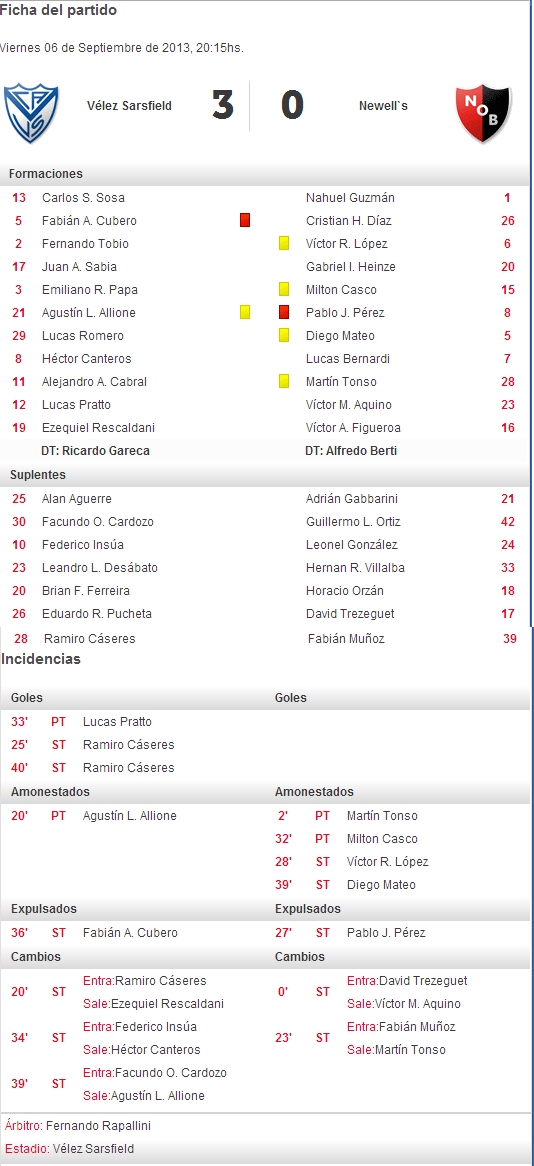 PRIMER TARJETA ROJA: Pablo Perez a los 26'ST sufre la primer expulsión rojinegra en el torneo. En el Final 2013 fueron 4 los expulsados (CASCO - HEINZE - y dos veces el DT MARTINO). En el Inicial 2012 fueron 6 (HEINZE - dos veces LOPEZ y tres veces el TATA MARTINO).