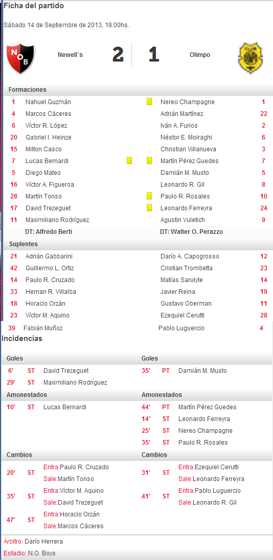 GOLES : Damián Mustos de Olimpo abre el marcador 0-1 convirtiendo su primer gol en primera y el 1º a la lepra. Por su parte David Trezeguet le da el empate parcial 1-1 a la lepra y convierte su 2º gol con la rojinegra, el 1º en el Coloso y el número 299 en su carrera deportiva. Y finalmente la fiera Rodriguez le da la victoria definitiva a Newells 2-1, convirtiéndose en el máximo goleador rojinegro del presente torneo con 2 gritos, junto a Aquino y a Trezeguet. La fiera suma su gol Nº 30 con la rojinegra en sus dos pasos por la institución, 27 en AFA y 3 por Copa Libertadores. Había convertido 20 goles antes de su regreso al Parque, y frente a Olimpo convierte su 10º gol en esta nueva y gloriosa etapa de su carrera deportiva. De esta manera se afianza como el máximo goleador actual del equipo rojinegro y alcanza la cantidad de goles que había logrado Ivan Gabrich (30) que durante mucho tiempo lo tenía como máximo goleador rojinegro en Torneos Cortos hasta la increible perfomance de Nacho Scocco que alcanzó los 50 goles. En la grilla de goleadores actuales, quien sigue a la fiera en segundo lugar es Pablo Perez con 17 tantos.