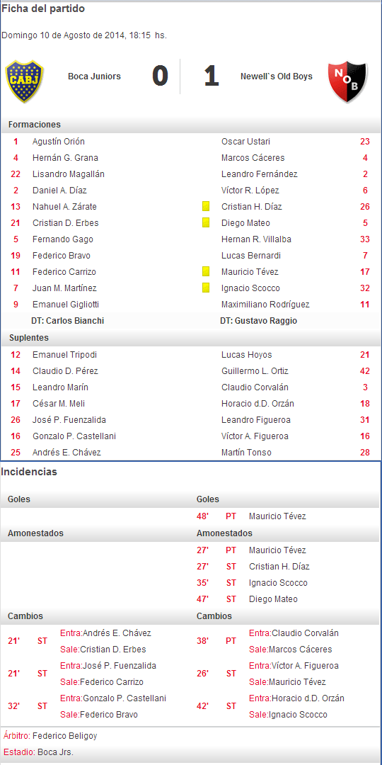 DEBUT CON GOL: Con apenas 18 años recién cumplidos (31/07/) el Juvenil Mauricio Tevez surgido de las divisiones inferiores del Club Atlético Newell's Old Boys, ingresó desde el arranque con la Nº 17 en su espalda y a los 48' PT cuando la primera etapa se moría, le pegó cruzado abajo del palo derecho de Orión y concretó el unico tanto del encuentro que le dió la victoria a los dirigidos por Gustavo Raggio. De esta manera Mauricio Tevez hace su debut oficial en primera división y también concreta su primer gol con la rojinegra en la primera de AFA. Los últimos jugadores que debutaron en Newell's con goles fueron, Fideleff en la fecha 7 del Clausura 2008 frente a Lanús, Muñoz en la fecha 12 del Apertura 2011 frente a All Boys y Rinaldo Cruzado en la fecha 5 del Torneo Final 2013 frente a Estudiantes.