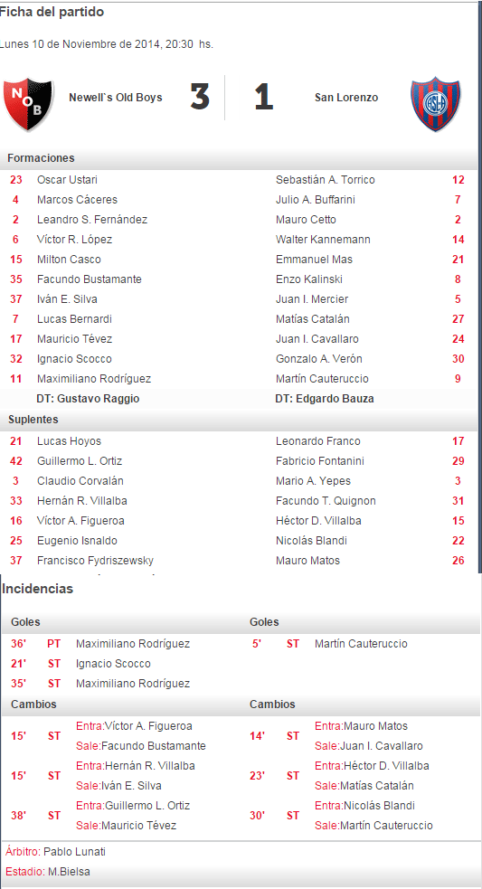 EL RESULTADO 3-1: En el historial de AFA, Newell's registra 86 triunfos con el resultado 3-1, de los cuales 57 veces fueron de Local y 29 de visitante. El primero llegó en la fecha 7 del torne de 1ª división 1940, fue el 19/05/1939 frente a Velez en el Amalfitani. De local el primer 3-1 también fue frente a Velez en la fecha 24 del mismo torneo de 1940 un 06/10/1940. El antecedente más inmediato data de la fecha 13 del Torneo Final 2013 ante Godoy Cruz también en el Coloso con dos goles de Nacho Scocco (uno de penal) y Nicolás Sanchez en contra para la lepra y Obolo para el Tomba. Ante San Lorenzo ganamos 3-1 en dos oportunidades y ambas de local, la anterio fue en la fecha 18 del Apertura 2006.