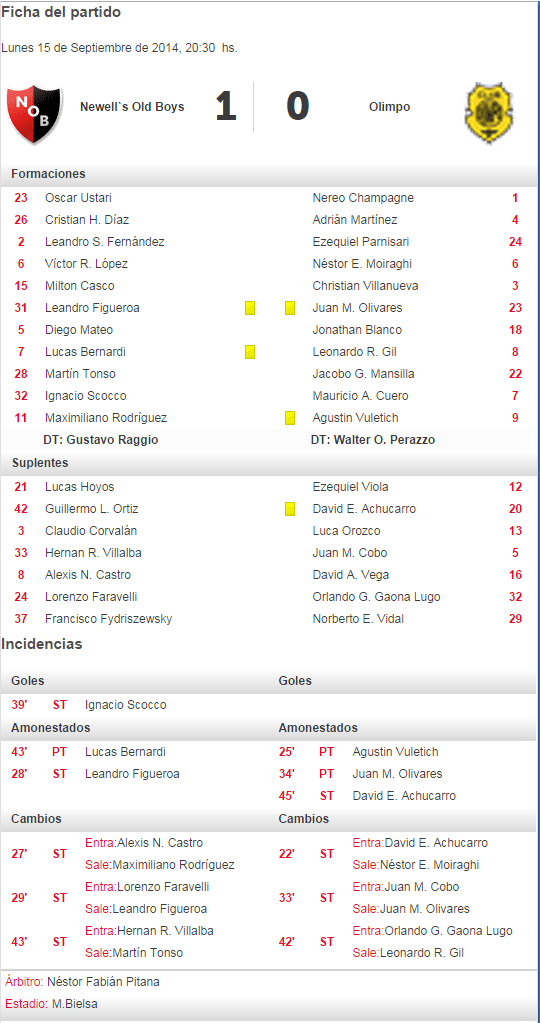 EL RESULTADO 1-0: En el historial de AFA, Newell's registra 251 triunfos con el resultado 1-0, de los cuales 170 veces fueron de Local y 81 de visitante. El primero llegó en la última fecha del primer torneo disputado por Newell's en AFA, fue el 02/12/1939 frente a Independiente en el Parque con gol de Gomez a los 41' ST. El antecedente más inmediato data de la fecha 5 del presente Torneo también en el Coloso ante Estudiantes con gol de Mauricio Tevez. Ante Olimpo, la lepra ganó 1-0 en 2 ocaciones, ambas fueron en el Parque, la anterior en la fecha 14 del Apertura 2002, con gol de Guillermo Marino a los 26'ST.