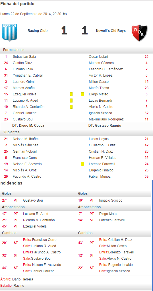 OTRA VEZ NACHO : Ignacio Scocco a los 10'PT le daba el triunfo parcial a la lepra con un golazo, marcando el gol Nº 11 de Newell's en el Torneo, su 2º gol en el campeonato y su gol Nº 42 en AFA, con un total de 52 goles si le sumamos los 10 por Copa Libertadores. Nacho está a 5 goles de ingresar al top ten de goleadores históricos rojinegros cuya posición Nº 10 le pertenece a Mario Zananbria con 57 goles. Nacho le convierte por 3º vez a Racing (Clausura 2006, Final 2013 y Transición 2014) y está a solo 2 goles de igualar a los máximos goleadores frente a la academia (Pontoni, Cantelli, Contini y Santamaría) todos ellos con 5 goles.