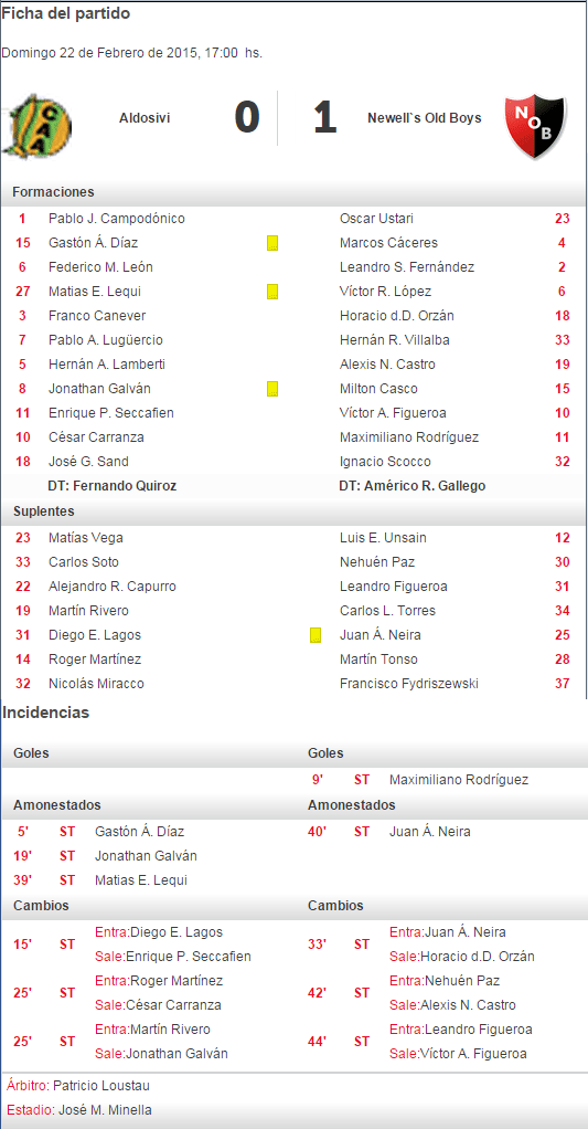EL PRIMER GOL: 22/02/2015 - MAXI RODRIGUEZ 9'ST - ALDOSIVI 0 NOB 1 |