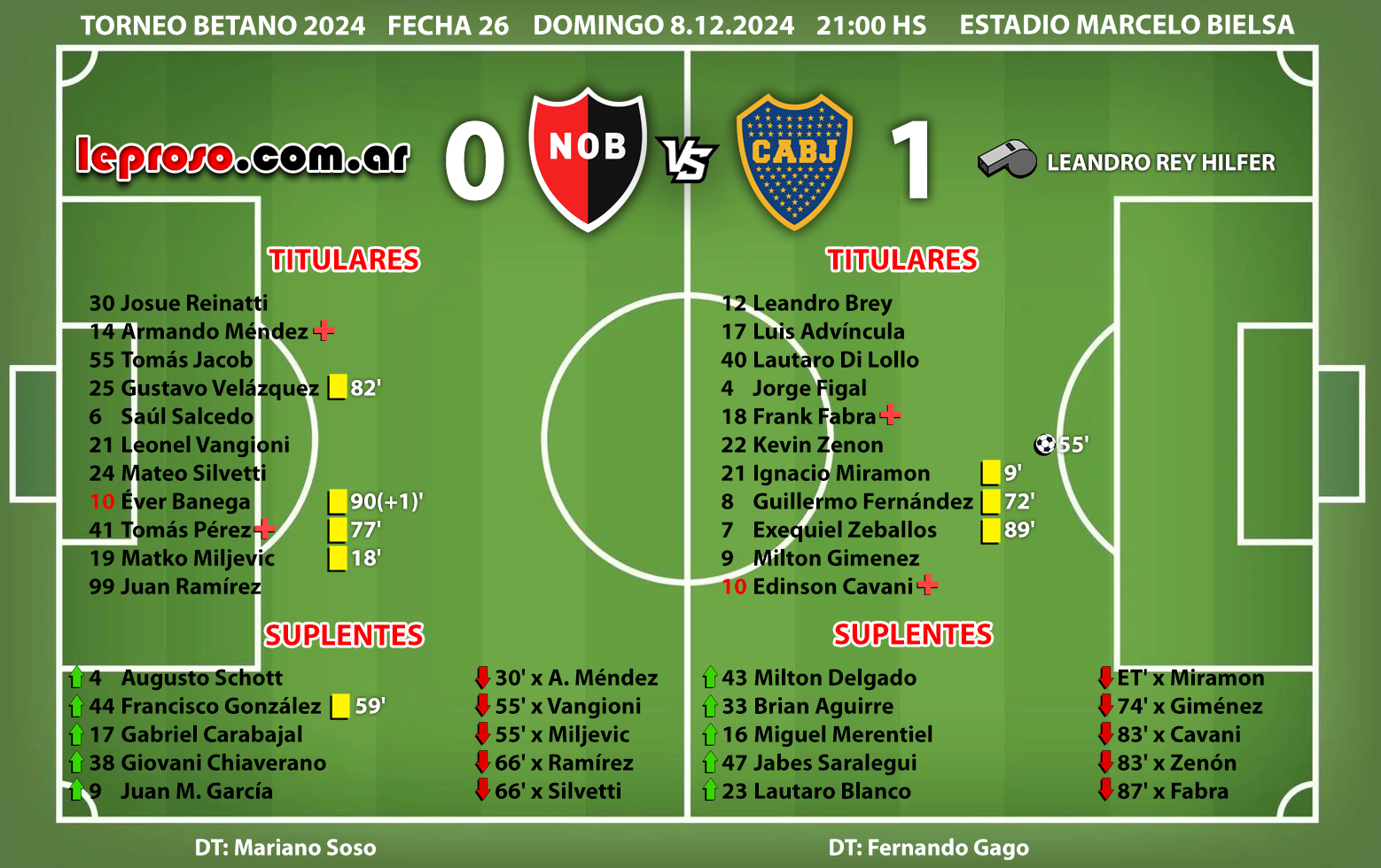 FERNANDO GAGO: enfrentó a NOB 5 veces, 4 dirigiendo a Racing, con 2 empates en 0, una derrota y un triunfo de su equipo sobre la hora, y 1 al frente de Boca, en total 2 victorias, 1 derrota y 2 empates. |