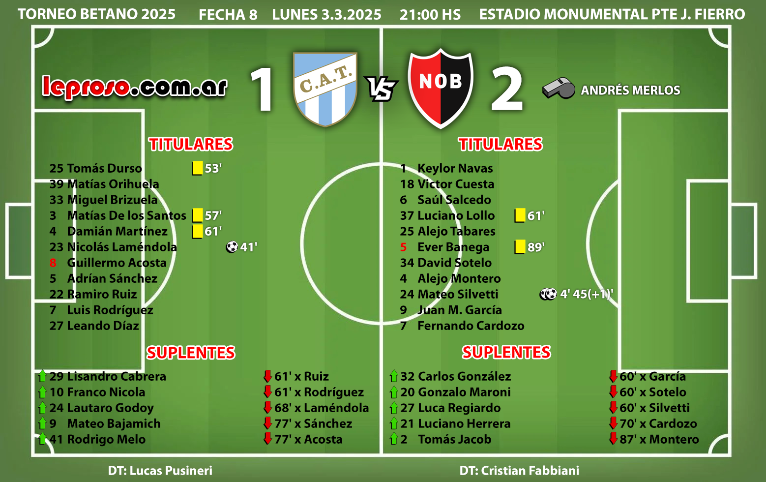 El árbitro Andrés Merlos dirigió a la lepra en condición de visitante en 8 oportunidades. En Tucumán se dió la primer victoria rojinegra, los otros 7 fueron 3 empates y 4 derrotas.